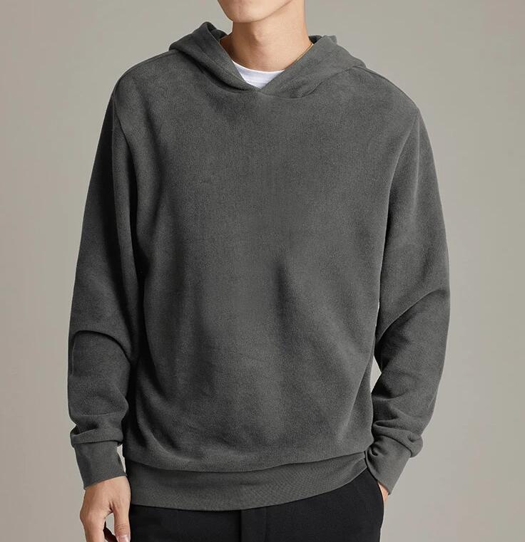 Lightweight hoodie for men with plunging sleeves for casual style and easy wear This casual hooded pullover is paired with casual pants for a comfortable and stylish formal look.